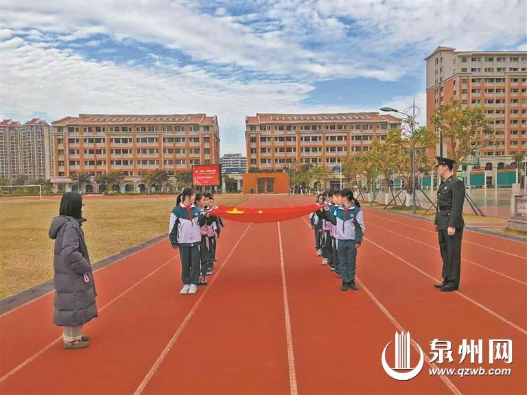 在操场上,原天安门国旗班护卫队蔡纪宏教官从站姿、列队、拿旗等基本动作入手,对泉州五中台商区分校、泉州师院附属小学台商区分校护旗手进行指导培训,小旗手们聚精会神地聆听教官的讲解,以饱满的热情和认真的态度投入培训中。