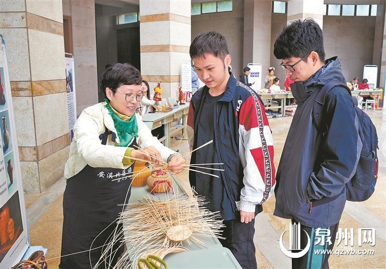 活动当天,现场还举行了非遗技艺体验活动。十位非遗传承人展示了安溪竹藤编技艺、蟳埔女习俗、泉州彩扎、泉州金苍绣技艺等各项非遗作品的制作过程和文化内涵。师生们积极参与体验,近距离感受非遗技艺的魅力,领略民间艺术的独特风采。
