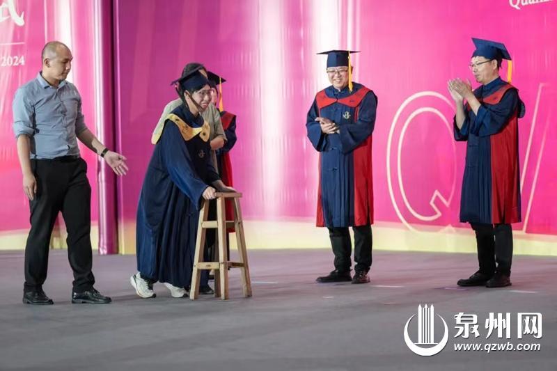 吴祥瑚撑着小木椅上台接受拨穗正冠礼