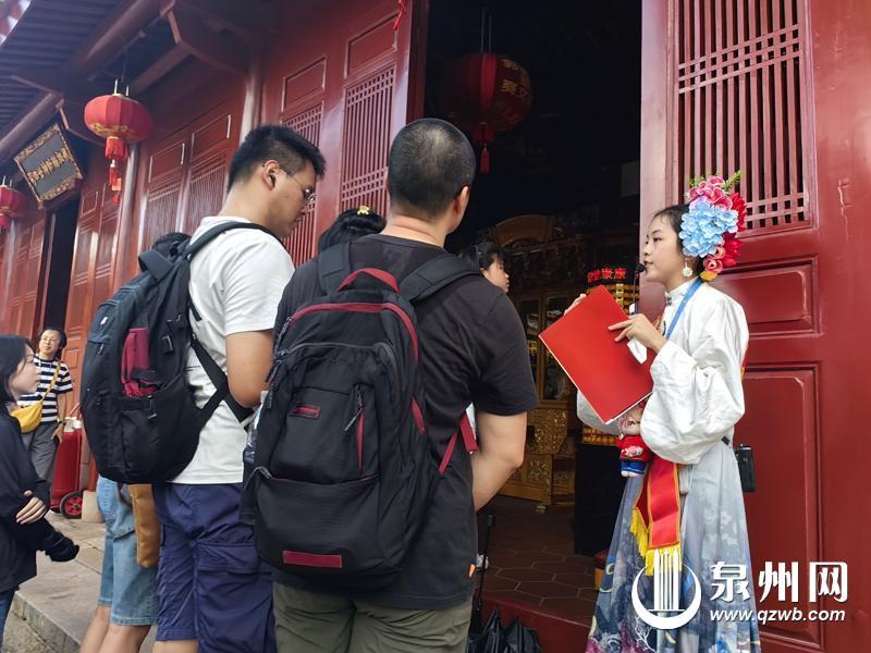 “入龙喉得好运,出虎口解厄运,这便是天后宫门口两处牌匾后动物肖像的寓意,欢迎大家进入天后宫‘得好运’。”头戴簪花、身穿汉服,17岁的公益讲解员许馨月结合自身的经历和感受,边走边讲,声情并茂地为游客呈现了一座立体、鲜活的天后宫,给来泉游客们留下了深刻的印象。国庆期间,这样的场景在泉州各大景点不时可见。
