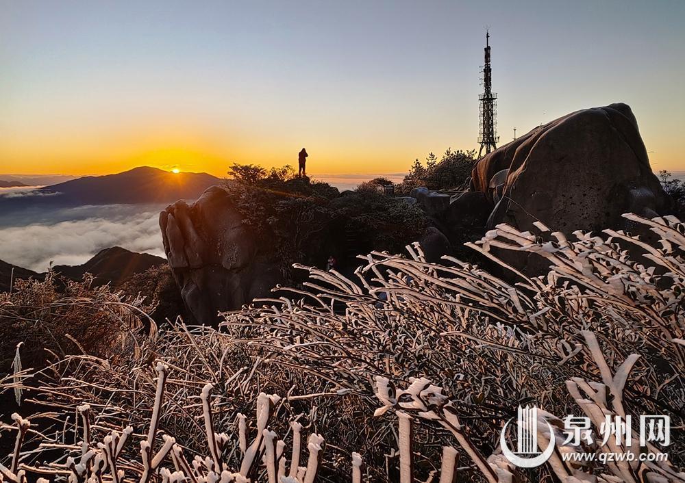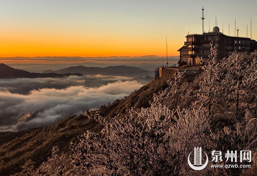 12月20日清晨,九仙山在日出时刻迎来美轮美奂的雾凇与云海。在日出之前,站在九仙山气象站附近远眺,山间白色云雾翻涌,即将醒来的戴云山犹如浮在云雾之上的静谧岛屿。6:49,初升的暖阳从戴云山的边缘探出了头,山间的云海,山坡的雾凇,山巅的气象站,瞬间被“点亮”。温暖的光芒,抚摸着脸庞,也为眼前的一切,涂上了金色的油彩。随着太阳越升越高,云海持续了大约一小时散去,晶莹剔透的雾凇,也开始消融。(通讯员徐伟东 融媒体记者陈起拓 图/文)