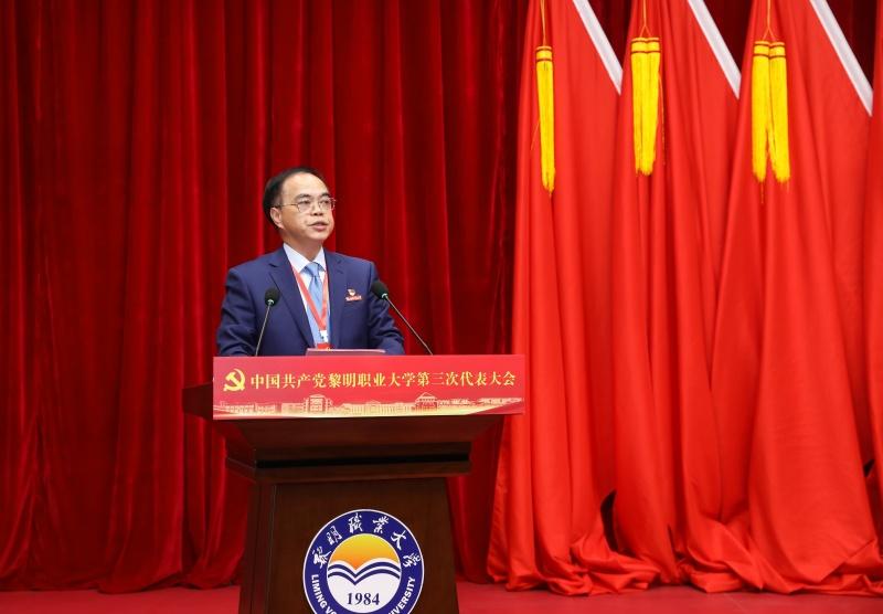 杨远志代表中国共产党黎明职业大学第二届委员会向大会作题为《赓续初心 踔厉奋发 为建成本科层次职业大学而努力奋斗》的报告。