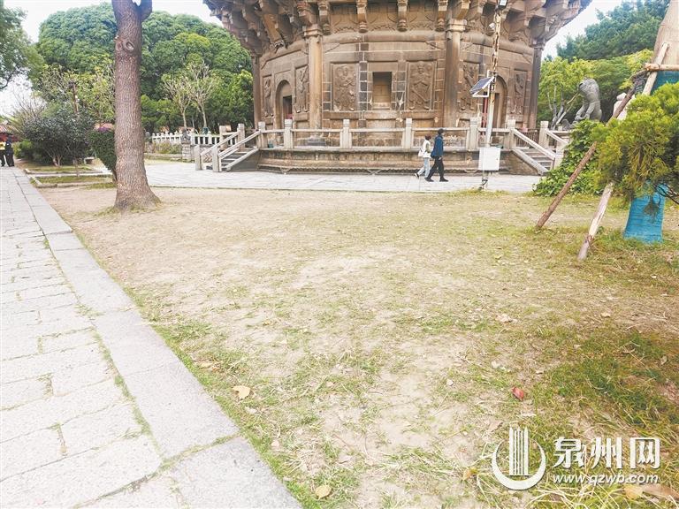 泉州开元寺是宋元泉州规模最大、官方地位最突出的佛教寺院。记者近日跟随市市容市貌观察团前往该寺,只见寺内道路整洁,古木苍翠,绿植遍布各个角落,清幽环境与古建筑内涵相得益彰。但在东塔附近,有一块与路面齐高的草地,草皮稀疏、绿意欠缺,还有一处衬托着龙眼树的坡状花围缺株明显,观感一般。