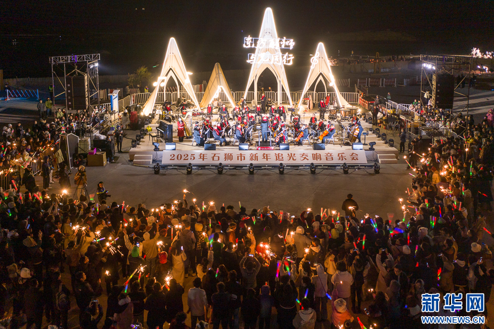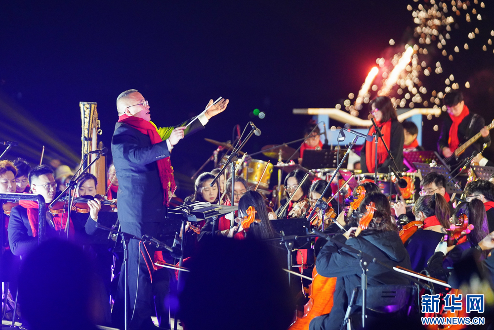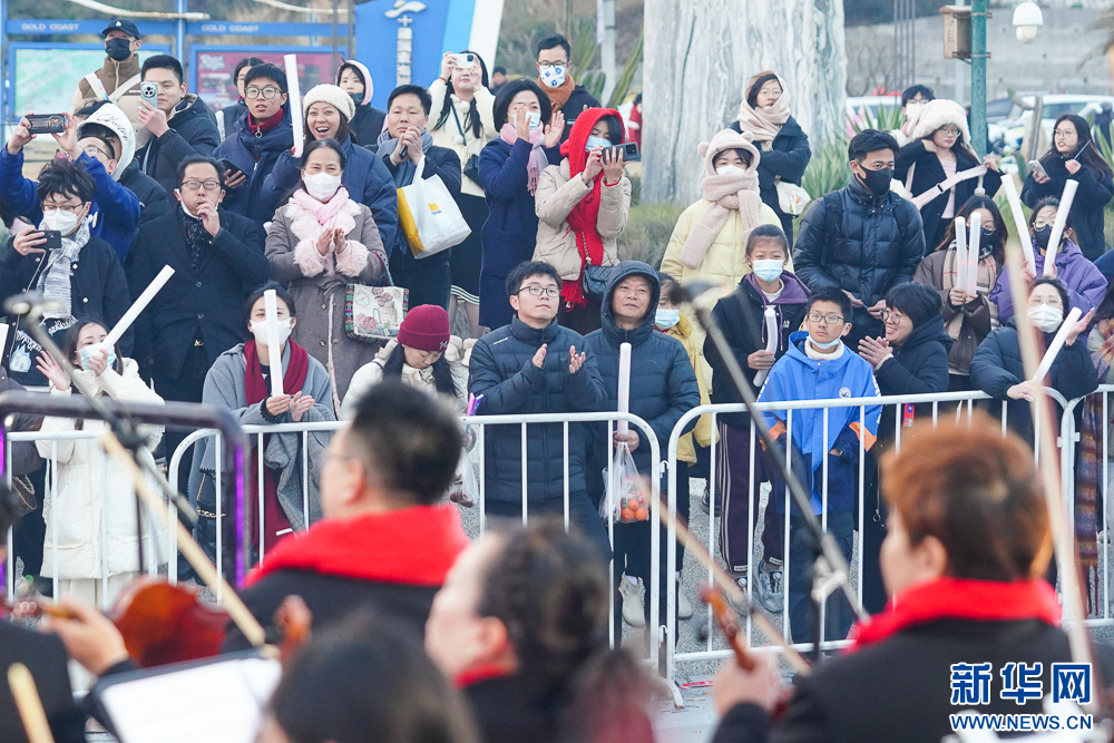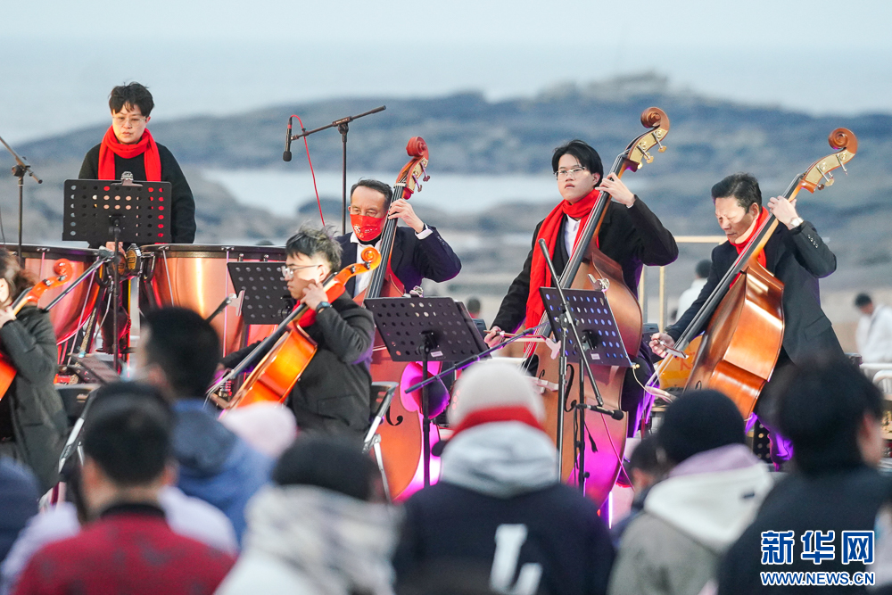 1月1日清晨,泉州石狮红塔湾海岸公园,交响乐团为市民、游客演奏乐曲,一同迎接新年。新华网 肖和勇 摄