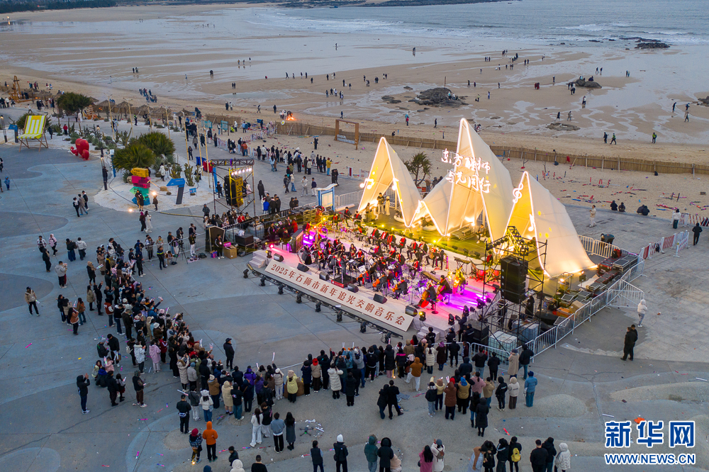1月1日清晨,泉州石狮红塔湾海岸公园,交响乐团在演奏乐曲,吸引很多市民、游客前来欣赏。人们在欢快的乐曲声中,迎接新年的到来(无人机照片)。新华网 肖和勇 摄