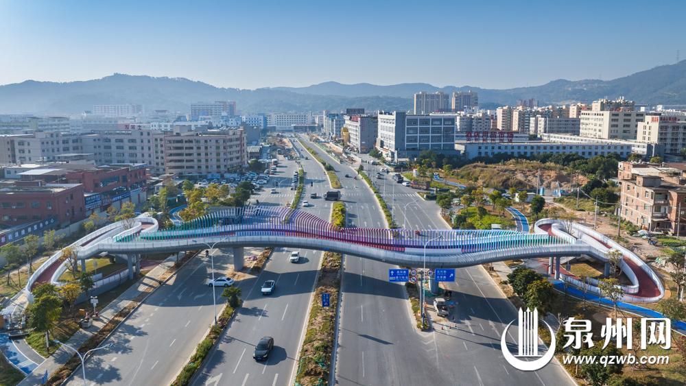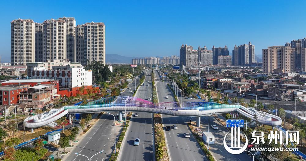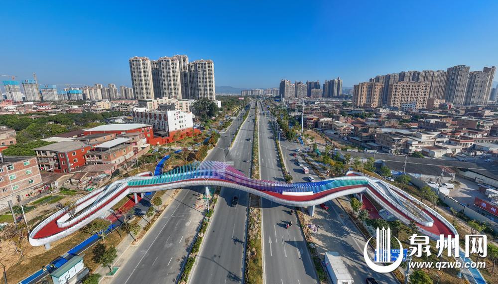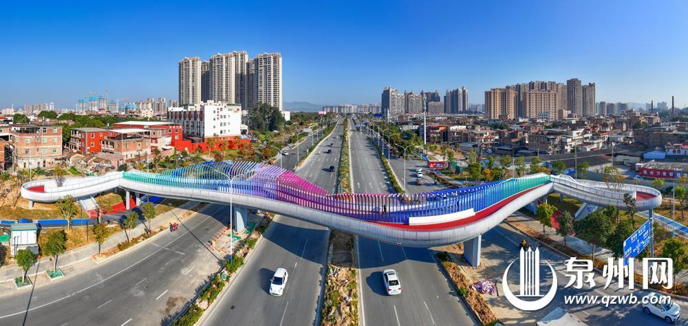 近日,由泉州城建集团投建的中环城贯通工程首个节点天桥——黄龙南大道快捷化改造工程4号天桥完工。该天桥位于鲤城区泉南公路以南,南环路以北,横跨黄龙南大道,主桥长86米,宽5.5至9.6米。项目以“听风”为题,采用“多跨连续钢梁+景观栏杆+炫彩景观构架装饰”的组合设计,用独特的椭圆形坡道结合双曲线型桥面打造活力氛围,色彩缤纷、充满动感。