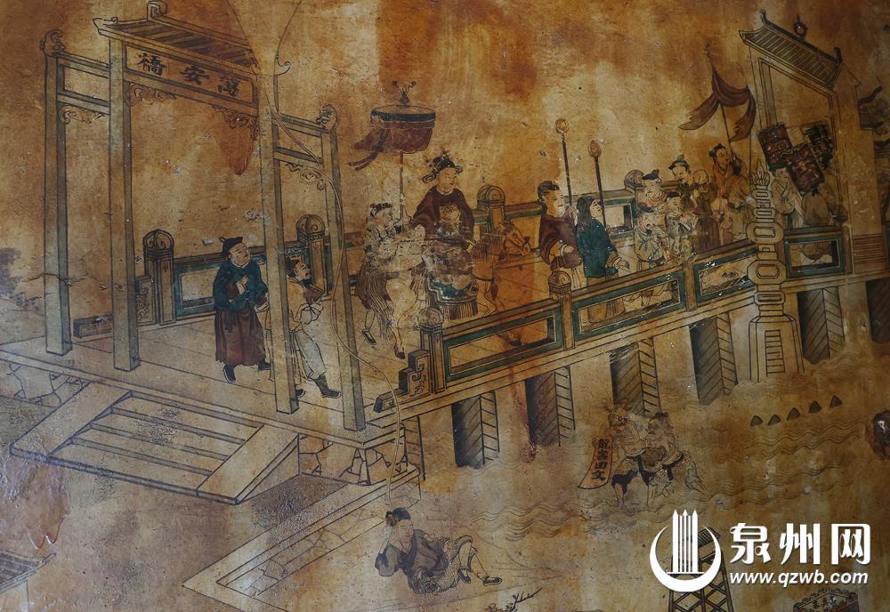 永春县五里街,全兴堂东屋花厅右墙上,一幅清代壁画《洛阳胜景》静静诉说着往昔的繁华与荣光。这幅由清代著名画家郑书铭于清乾隆四十年(1775年)绘制的彩墨工笔画,以其独特的布局和精细的画工,细腻描绘了洛阳桥及其周边的壮丽景色。其人物惟妙惟肖、故事活灵活现、建筑错落有致,历经两百多年的岁月沧桑,或为泉州现存唯一的清代洛阳桥相关壁画。据称,1993年洛阳桥重修时,还曾以此画为依据恢复原貌。
