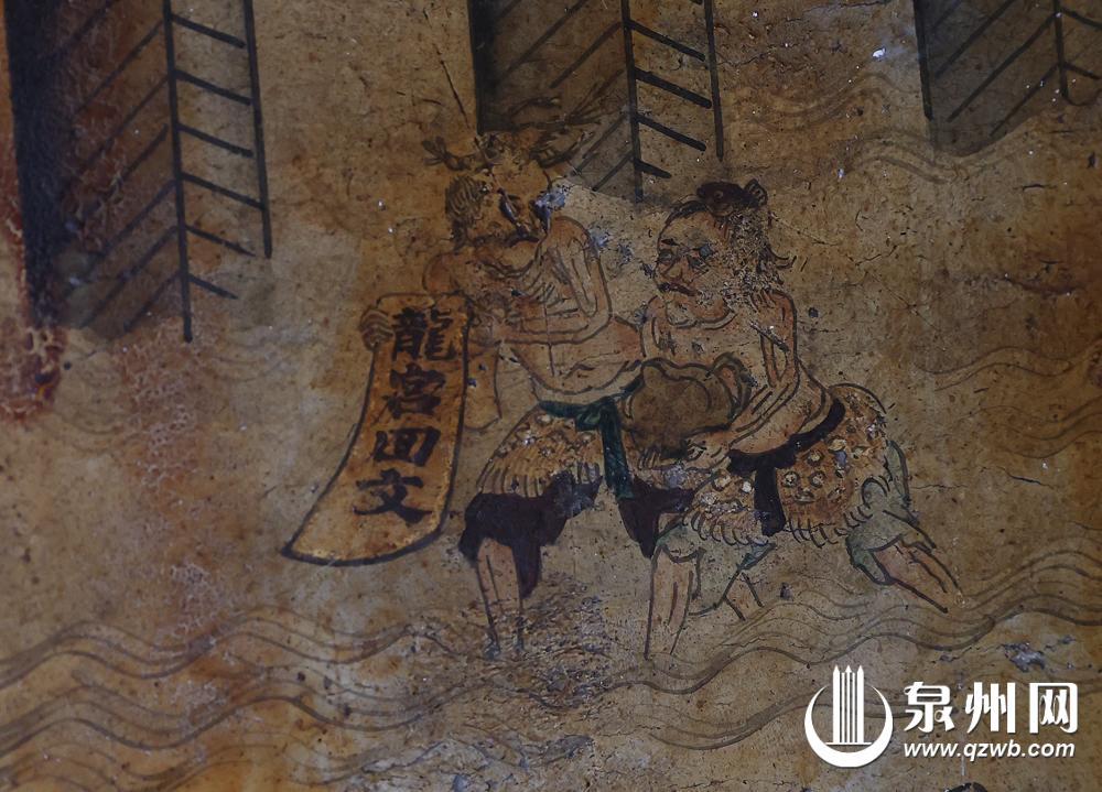 第一个故事,是关于醉卧于江边的人,名叫“夏德海”。传说,北宋泉州太守蔡襄建造洛阳桥时,因海上风大浪急,每次投料筑墩,石料都被海浪卷走,造桥工程难于进行。蔡襄修书一封祈求海龙王保佑,可谁能下海给龙王送信呢?蔡襄张榜告示“谁下得海,赏银百两”,但无人应聘。一天,“夏德海”在醉茫茫时接了手令,来到江边,一时又陷入了沉睡中。潮起潮落间,仿佛在梦里,“夏德海”的公文被一位鬼将拿走,送给了白龙太子。白龙太子批准,又让两位夜叉小鬼送了龙宫回文,交到他的手中。待酒醒时,只见“夏德海”身上的书信变成了一张黄色的信牒,牒上只有一个“醋”字。蔡襄见字拆解,“醋”字为廿一日酉时,于是他也知道了建桥的时间。果然,当日潮退见底,桥墩如期筑成。