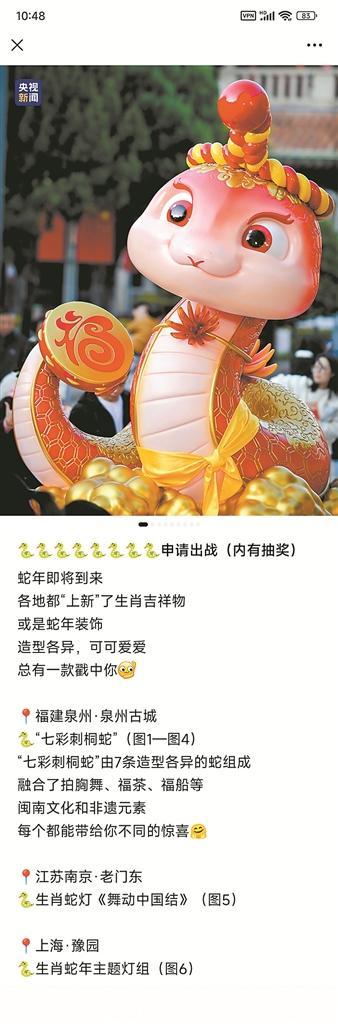 “蛇年即将到来,各地都‘上新’了生肖吉祥物,或是蛇年装饰,造型各异,可可爱爱,总有一款戳中你。”昨晚,央视新闻微信公众号刊发推文,其中第一个介绍泉州2025年蛇年生肖IP“七彩刺桐蛇”,还优先配发了老大“海海”、老四“州州”、老二“丝丝”、老七“鲤鲤”的美照。在留言区,作者还表示,将在评论区随机抽取15名网友,送出“七彩刺桐蛇”的文创礼包,马上得到全国网友的热烈响应。