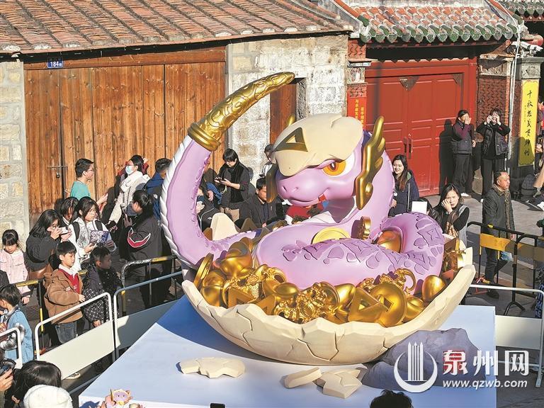 “妈妈,这条蛇好酷哟。”“鲤鲤”刚运达现场,立即引起众人的关注。一身紫气的它,头顶一片蛋壳,两侧各戴一片翼状黄金护甲,尾部也镶嵌着金甲,蛇身斑纹与闽南建筑风貌中的“花砖”经典纹样巧妙结合,表情霸气却带点萌态。