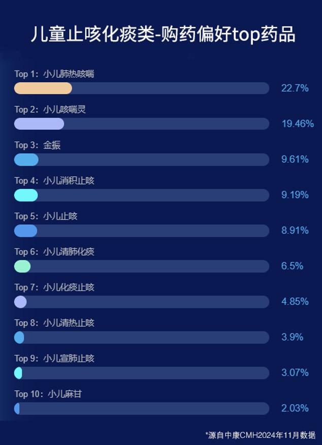 流感高发带动了儿童抗感药品市场的活跃。中康CMH数据显示,2024年11月以来,儿童止咳化痰类购药偏好中,小儿肺热咳喘以22.7%的占比位列TOP1,这一数据充分证明了其在缓解儿童流感症状、促进康复方面的独特优势,获得市场、家长的认可。