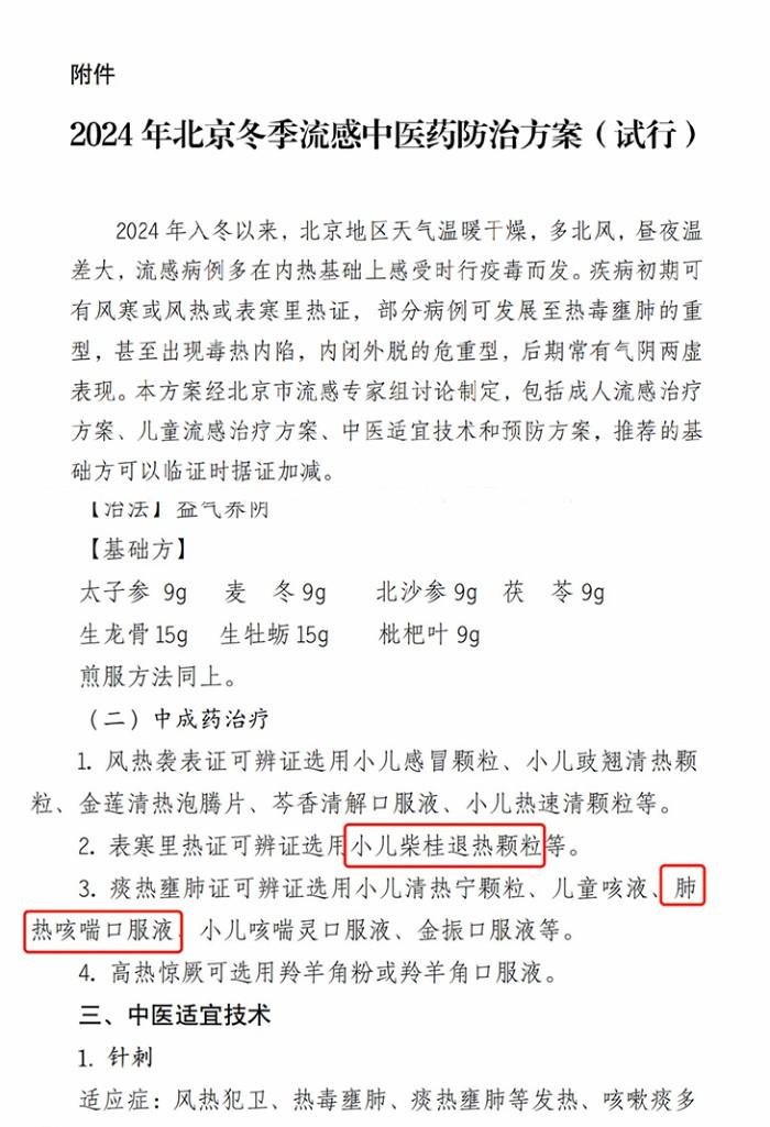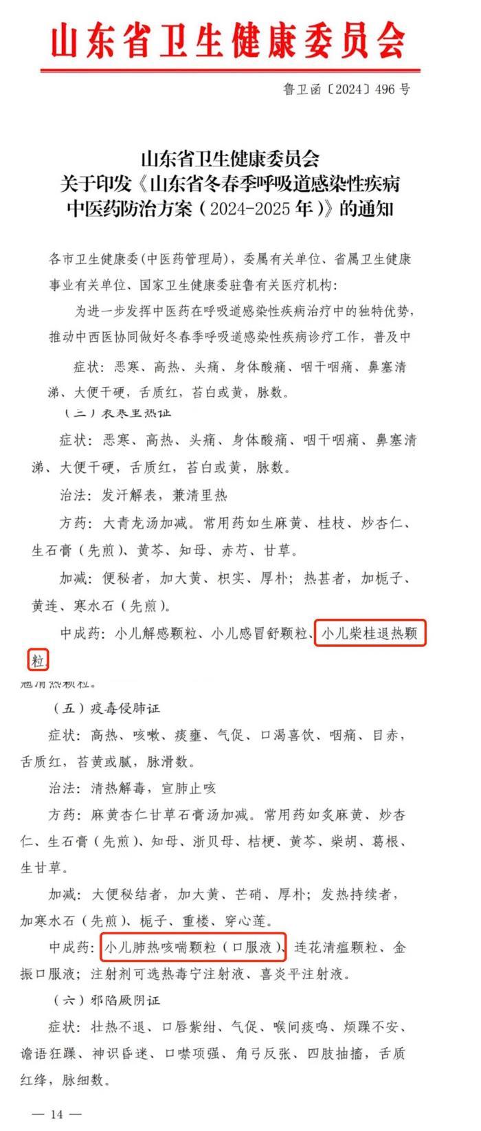 此外,在今年山东省卫健委发布的《山东省冬春季呼吸道感染性疾病中医药防治方案(2024~2025年)》、北京市流感专家组制定的《2024年北京市冬季流感中医药防治方案(试行)》等多省流感方案,也推荐可辨证选用小儿肺热咳喘口服液、小儿柴桂退热颗粒等中成药。