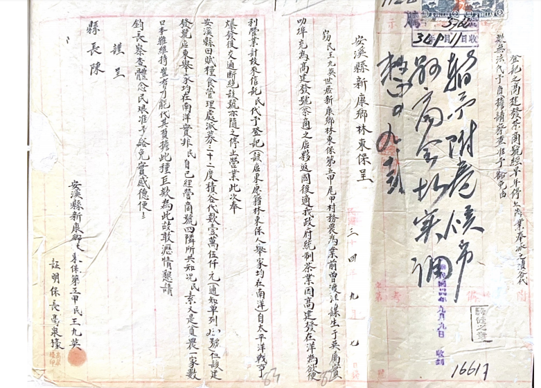 记者在采访中收集到一份民国三十四年(1945)安溪县新康乡林东保呈给陈县长的陈情,文件主要内容是:安溪县田赋粮食管理处科以高建发在安溪的商号15000元的税赋,但太平洋战争后,交通断绝,高建发国内的商号停止运营,故申请豁免。