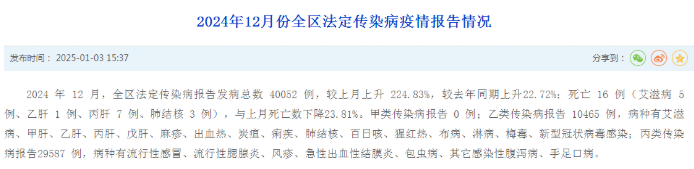 2024年12月,全区法定传染病报告发病总数 40052 例,较上月上升 224.83%。其中丙类传染病报告29587 例,病种有流行性感冒、流行性腮腺炎、风疹、急性出血性结膜炎、包虫病、其它感染性腹泻病、手足口病。