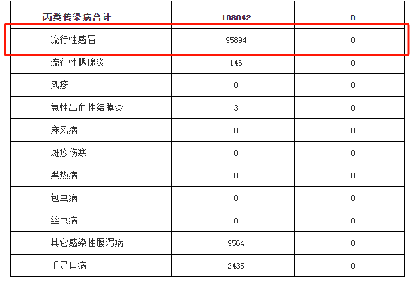 2024年12月(2024年12月1日0时至12月31日24时),全省共报告法定传染丙类传染病共报告108042例,未报告死亡。报告发病数居前3位的病种依次为流行性感冒(95894例)、其他感染性腹泻病和手足口病,占丙类传染病报告病例总数的99.86%。