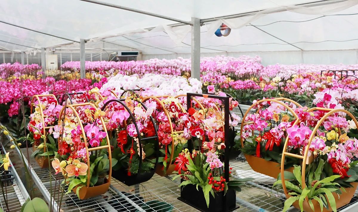 “为保障蝴蝶兰品质,基地在玻璃温室大棚安装了先进的暖气设施和滴灌设备,风筒也会定时自动换风。”永安村蝴蝶兰生产基地销售经理郭康介绍,“为满足不同客户的个性化需求,基地每年都会调整蝴蝶兰的品种结构,以供应年宵花花卉市场。今年年宵花销售旺季主要在元旦后至春节前,届时平均每天的销售量能达5000–10000株。”