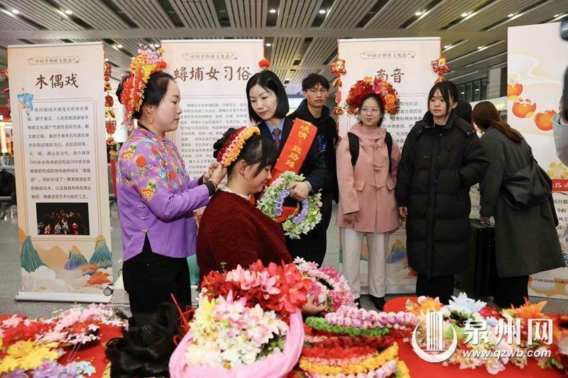 “簪花承载着喜气和福气,早已成为我们当地民俗中不可或缺的一部分了。”泉州站候车室里,蟳埔女簪花围国家级非物质文化遗产的传承人还带来了各式各样的蟳埔女服饰供旅客朋友们穿着体验。旅客朋友们学习蟳埔女戴花打扮,色彩鲜艳的簪花围搭配别具一格的大裾衫,为车站增添了一抹浓厚的喜庆新年色彩。“旅客朋友头戴鲜花拍照打卡,我们泉州的非遗民俗也在这个非遗春节里跟随高铁走出泉州、走向全国,被越来越多的人熟知,在高铁线上撒下了一粒粒非遗传承的火种。”簪花围非遗传承人开心地笑了起来。