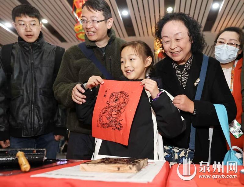上午9时,泉州站候车大厅中央的舞台人头攒动,热闹非凡,非遗传承人面对面向旅客朋友们展示高甲戏、木偶戏、南音、簪花、木板年画等国家级代表性非遗项目,用生动的语言讲解每个物件背后的非遗文化故事,非遗春节和泉州非遗在泉州站碰撞出了艳丽的火花。泉州非遗深深吸引了众多正在返乡路上的旅客朋友,旅客朋友在返乡途中观赏扣人心弦的非遗戏曲、体验寓教于乐的非遗手作,感受非遗匠人的传奇色彩和非遗春节的独特魅力。