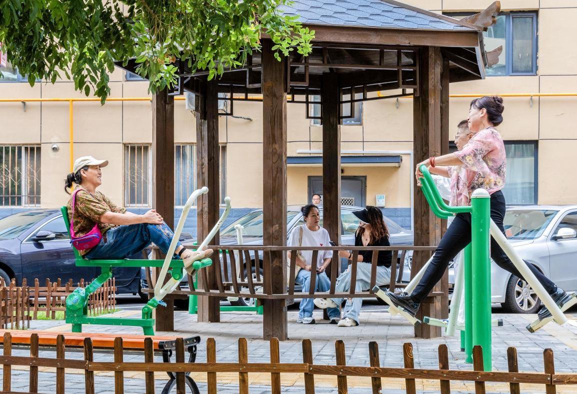 2024年8月26日,内蒙古呼和浩特市玉泉区绿缘小区,居民在改造后的运动休闲区健身。