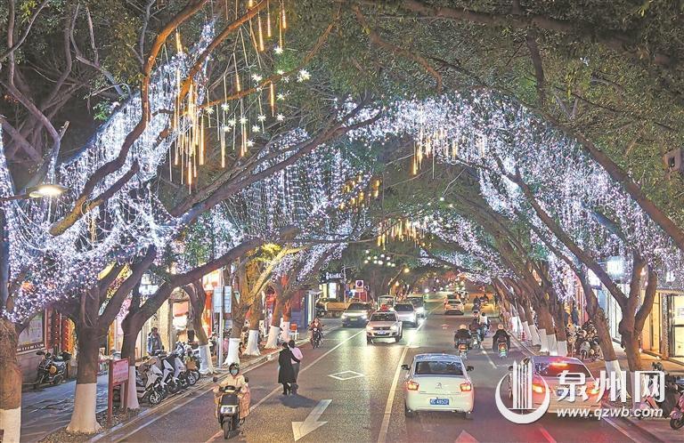 在泉州真武庙广场,红灯笼高高挂起,“福”字造型的灯光装置已亮起,加之石头街上的红砖赤瓦、古榕参天,让整个街区既古香古色又年味浓厚。在东海隧道口,绿化带上的线性造型灯,绿化树上的黄灯笼,树干上的灯带,相互映衬,远远望去,好像一片灯光的海洋。各式各样的新春“氛围组”陆续上线,夜景灯饰逐渐亮起,让年味愈发浓郁。