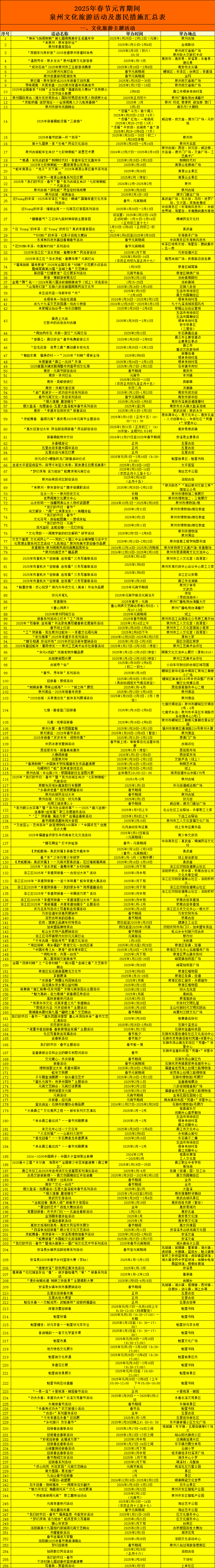 为喜迎2025年春节、元宵节,营造浓厚的节日氛围,泉州市各地各部门结合实际,组织开展以“欢乐泉州 喜迎新春”为主题的2025年春节、元宵节文化贺岁活动,线上线下齐联动,共设三大类300多项精彩活动,伴您度过一个温馨、祥和、幸福的文化年。