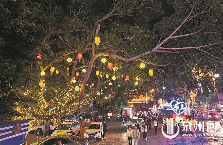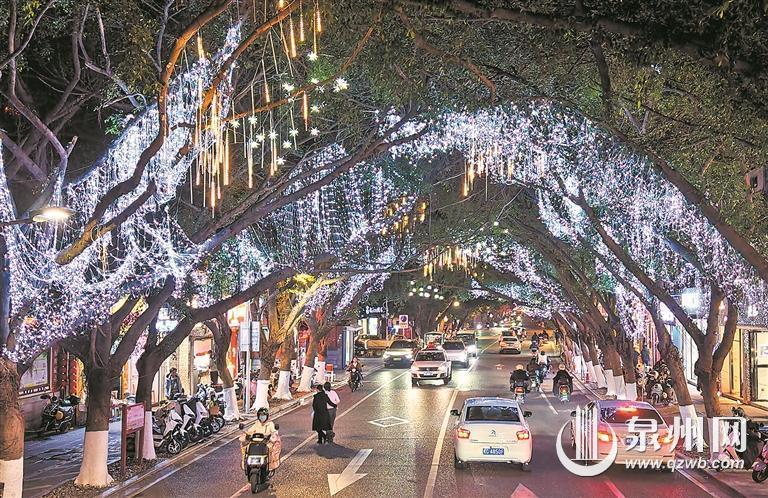 泉州城区各个主要街道两侧的行道树上,也都陆续悬挂红彤彤的灯笼,装点得格外喜庆。