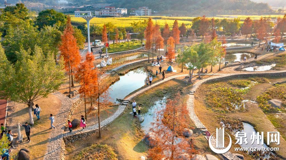 一段时间来,永春县石鼓镇湿地公园的落羽杉林“换上红装”,在冬日暖阳的照耀下熠熠生辉,与周边的乡村、田园、河流等自然和人文景观相映成趣、美不胜收,吸引众多游客前来观赏、游玩。图为,众多游客在永春县石鼓镇湿地公园观赏、游玩。(融媒体记者 陈小阳 通讯员 康庆平 摄)