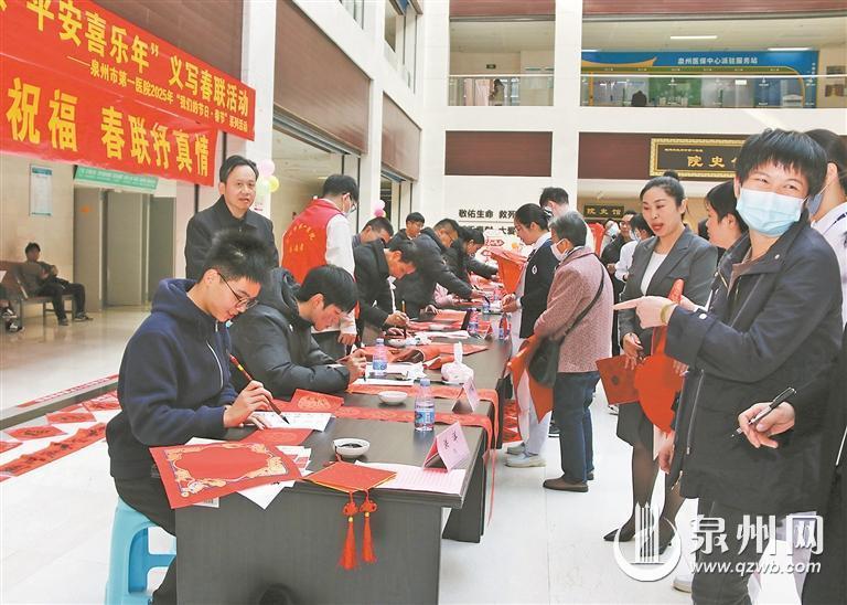 活动现场,长桌红纸铺展,由该院医护人员、家属组成的书法志愿者以及泉州市青年书法家协会的书法家们,为广大患者、群众、医护人员等书写春联、福字,送上新春祝福。