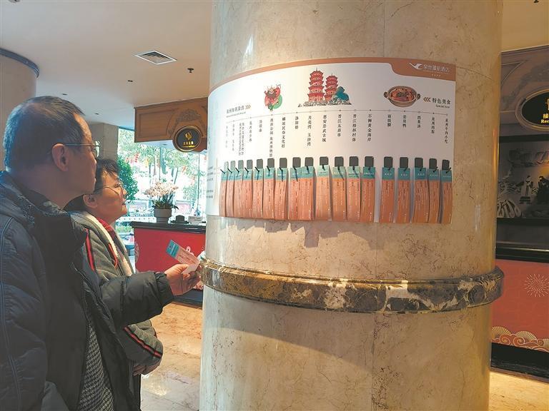 17日早上,走进位于中心市区丰泽街的一家四星级酒店,记者随即被柱子上的“旅游指南”吸引。一张张精心设计的旅游攻略卡片整齐排列,涵盖泉州知名景点和特色美食的相关介绍和导引。例如,如果想去泉州海外交通史博物馆,可从酒店出发到儿童医院站上车,乘坐41路公交车,预计29分钟行程。除此之外,电梯口处还设置了更详细的旅游攻略,涉及旅游景点、非遗体验、美食、民俗文化、艺文空间和网红打卡机位六方面的内容。