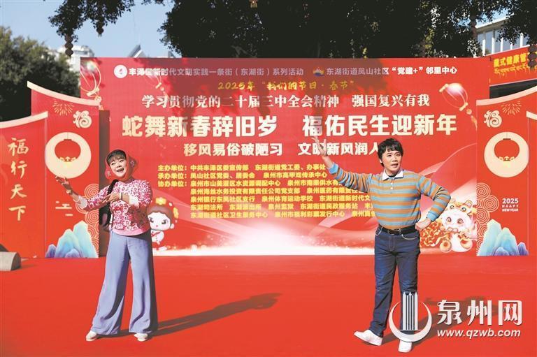 当天,丰泽区委宣传部、泉州市高甲戏传承中心等单位,联合开展“蛇舞新春辞旧岁 福佑民生迎新年”暨移风易俗主题活动。居民们带来自编自导自演的腰鼓表演,为活动开场“热身”。泉州市高甲戏传承中心10多名演员带来多个高甲戏片段。