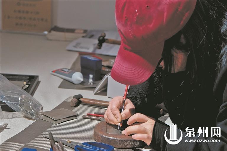 在泉州珠绣非遗传承人陈克忍的指导下体验珠绣(彭燕珍 摄)