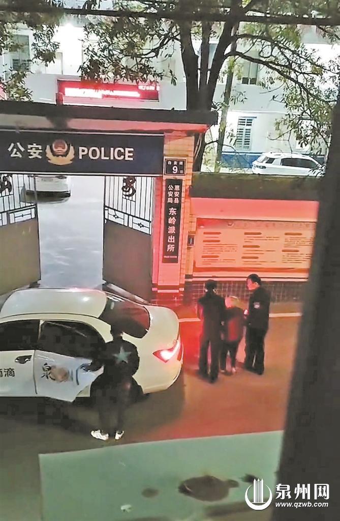 视频中,一辆前后车门上分别写着“滴滴”和“泉州”的白色小车停在惠安县公安局东岭派出所门口,一名满头白发的老人从车辆后排下车后,民警小心翼翼地将其搀扶进派出所,司机随后驾车离开。