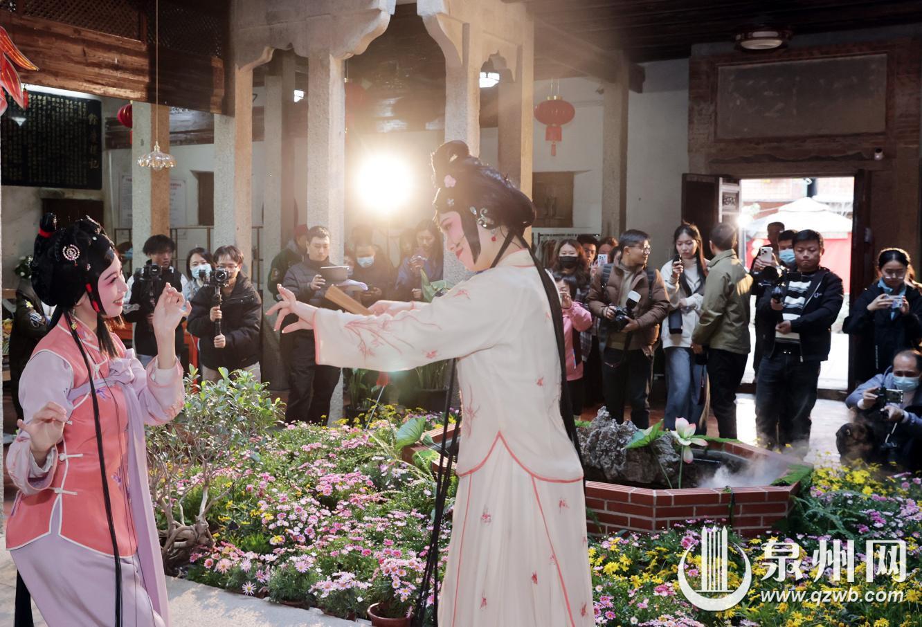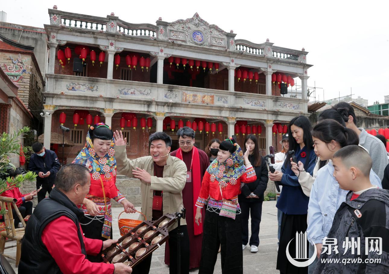 “来喽!”下午3时许,身着惠安传统服饰的“讲述人”开门迎客,开启了梨园戏《陈三五娘》沉浸式互动演绎的序幕。余庆楼外,妆糕人、十音铜锣、掌中木偶、俞家棍等丰富多样的泉州非遗文化,在“讲述人”的插科打诨中悉数亮相;余庆楼前,梨园戏演员们身着戏服,身姿绰约,从楼内鱼贯而出,与观众近距离互动。