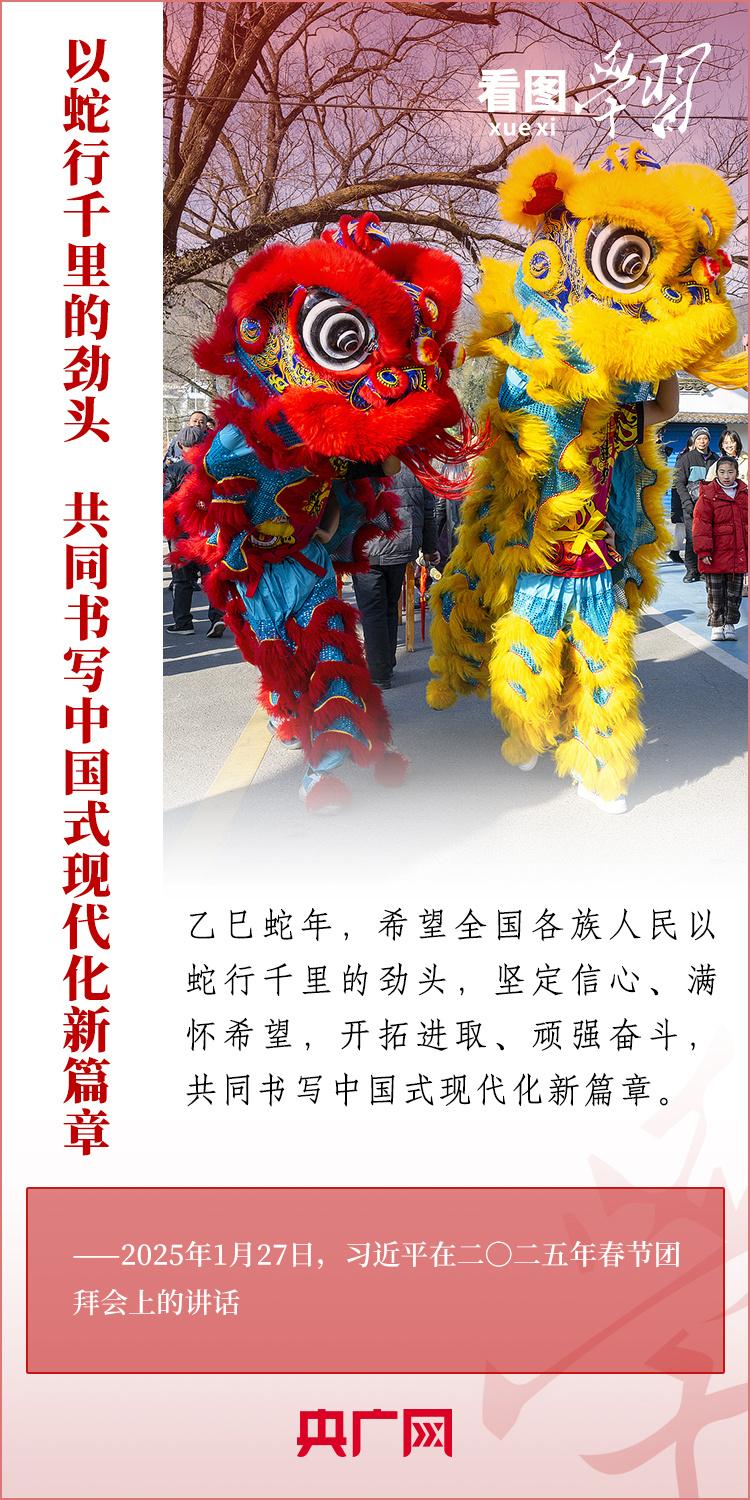1月27日,中共中央、国务院在北京举行春节团拜会,习近平总书记发表热情洋溢的讲话,向全国各族人民、港澳台同胞、海外侨胞拜年并致以新春祝福。总书记在讲话中深情回顾过去一年中国式现代化取得很不平凡的发展历程,“希望全国各族人民以蛇行千里的劲头,坚定信心、满怀希望,开拓进取、顽强奋斗,共同书写中国式现代化新篇章。”一起来学习!