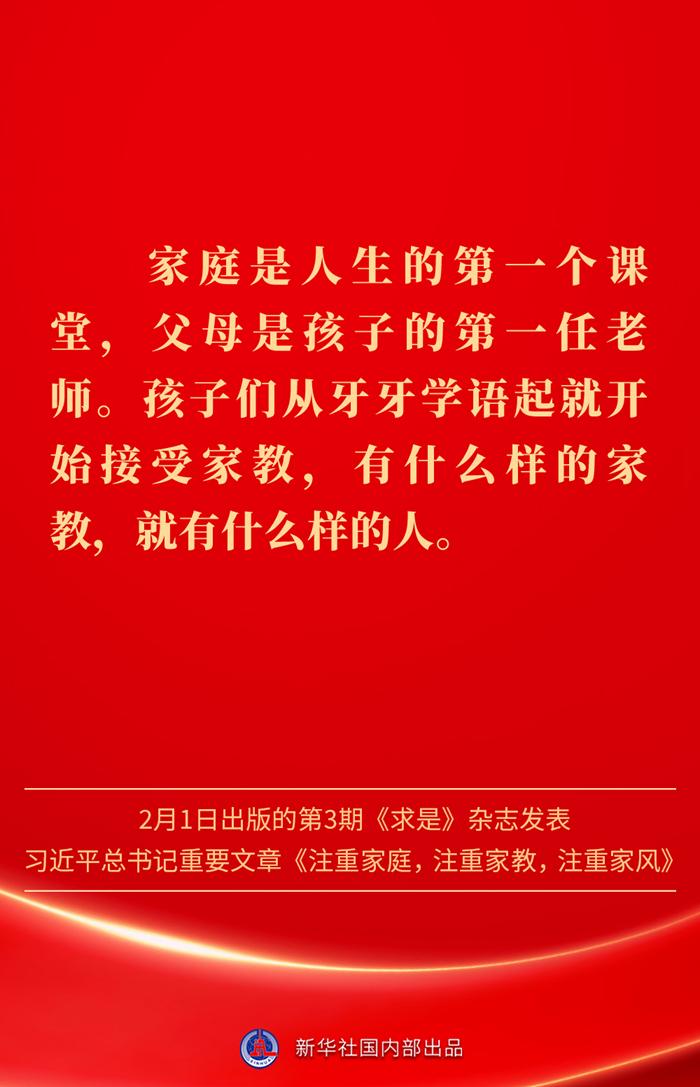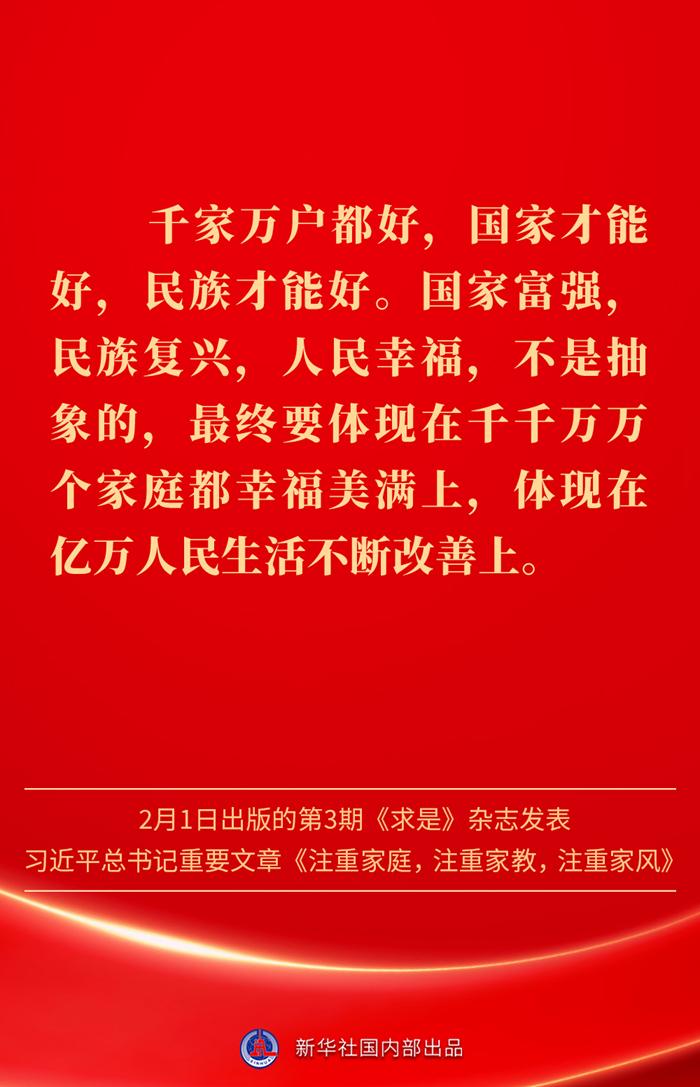 万家团圆共庆新春佳节之际,2月1日出版的第3期《求是》杂志发表习近平总书记重要文章《注重家庭,注重家教,注重家风》。为什么要注重家庭、家教、家风?如何做好家庭文明建设?习近平总书记这样阐述——