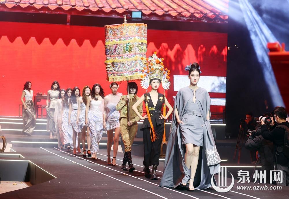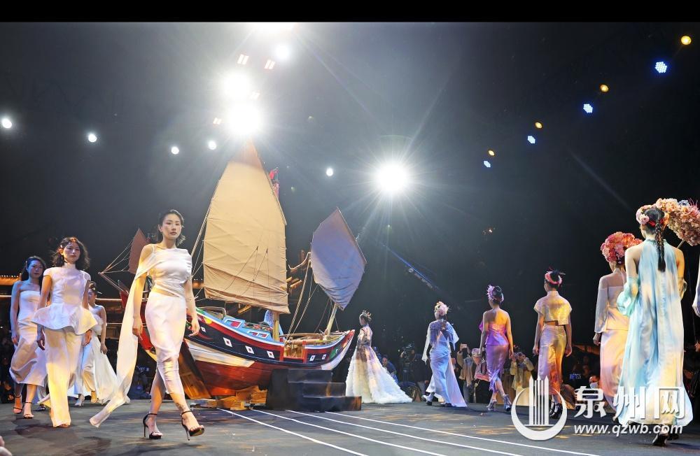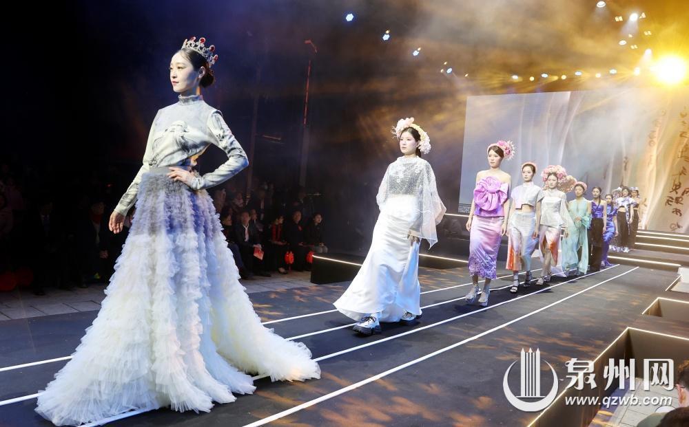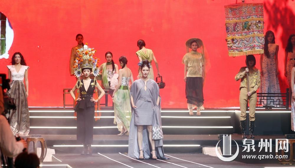 而以海丝文化和安溪茶文化为灵感设计的世遗霓裳惊艳了全场。金苍绣的精美细腻、茶元素的清新淡雅与时尚华裳相得益彰。身着华丽服饰的模特从精心搭建的闽南民居布景中徐徐走来,步伐轻盈,仪态万方,传统与现代在此完美融合,生动再现了宋元泉州贸易繁荣的辉煌历史。