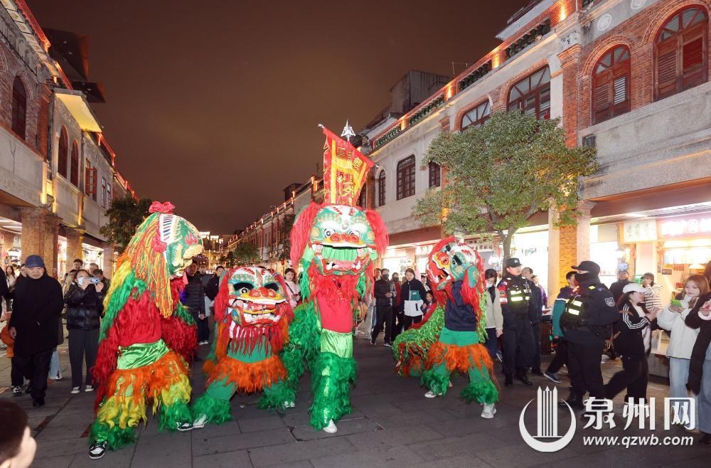 活动一开始,提线木偶戏等泉州非遗依次登场。紧接着,鼓声起,雄狮舞,非遗青狮与北狮身披彩衣,随着鼓点节奏翻滚跳跃,展现出泉州人民乘风破浪、勇敢坚韧的精神风貌,为新春送上祝福,喜迎八方来客。