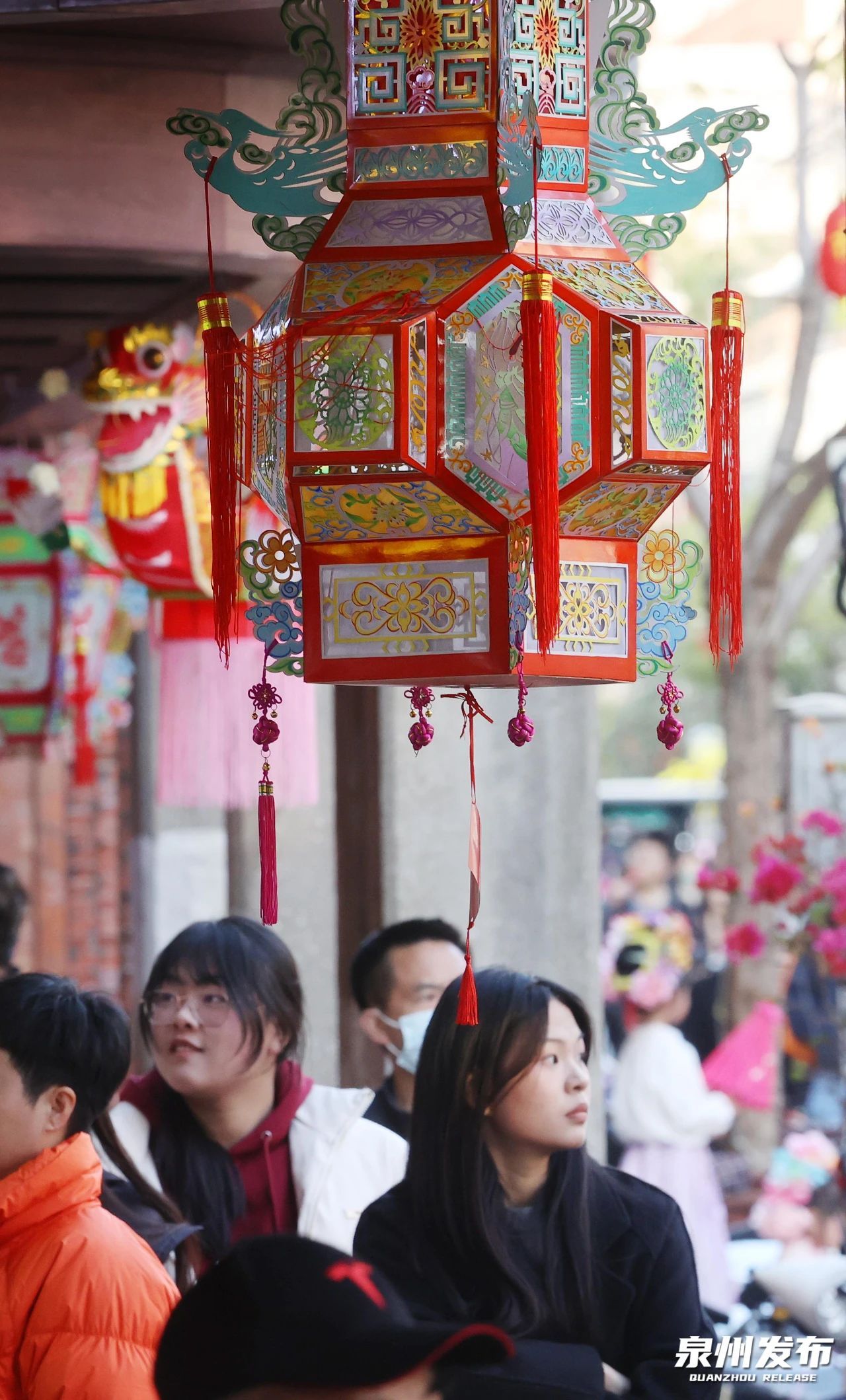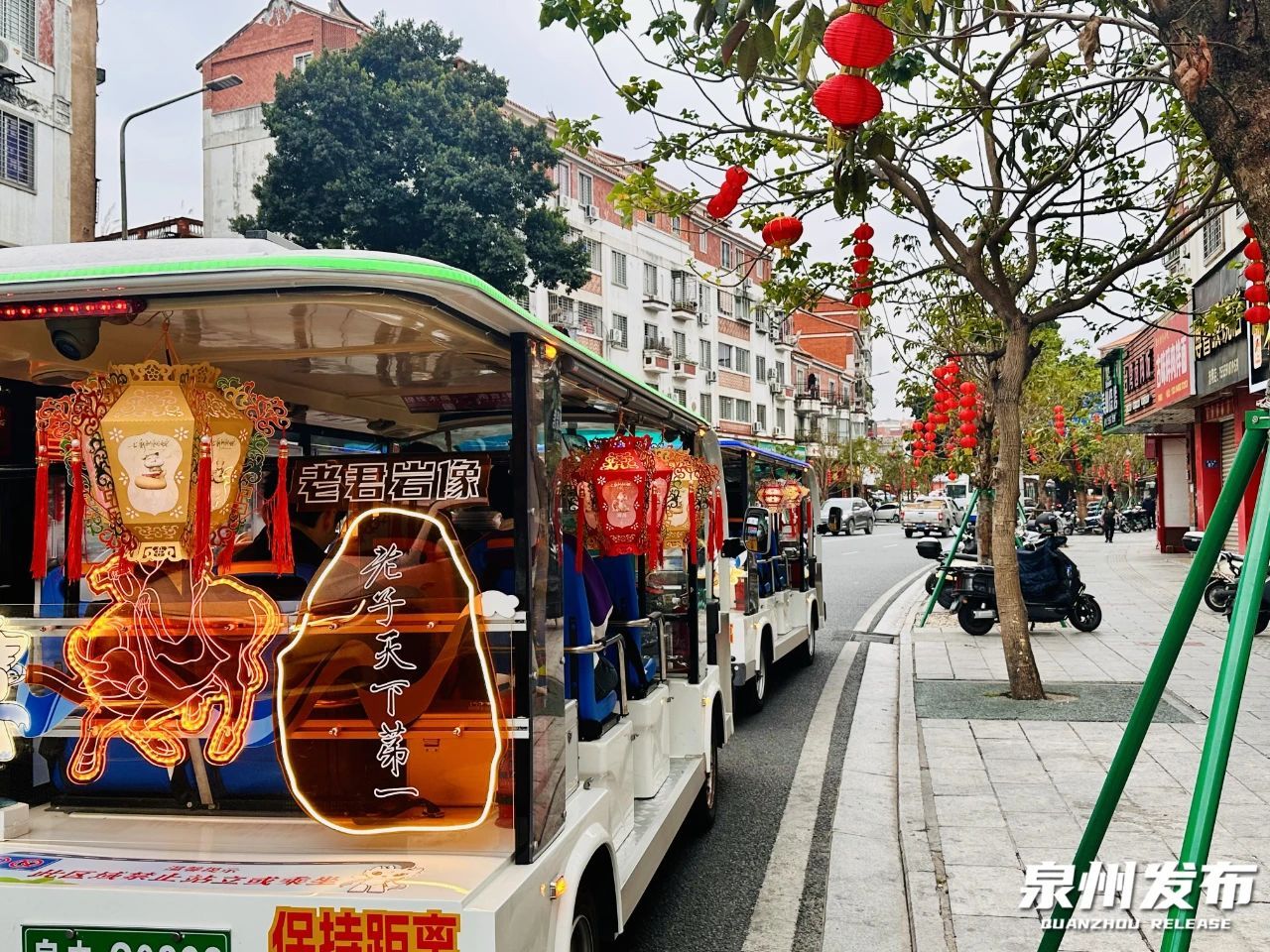泉州各县(市、区)在主干道、文化广场、大型商超、城市综合体、公园、山线和水线沿线等重要道路、重要节点,布设中国结、花灯、红灯笼、“福”文化景观小品、造型座灯。