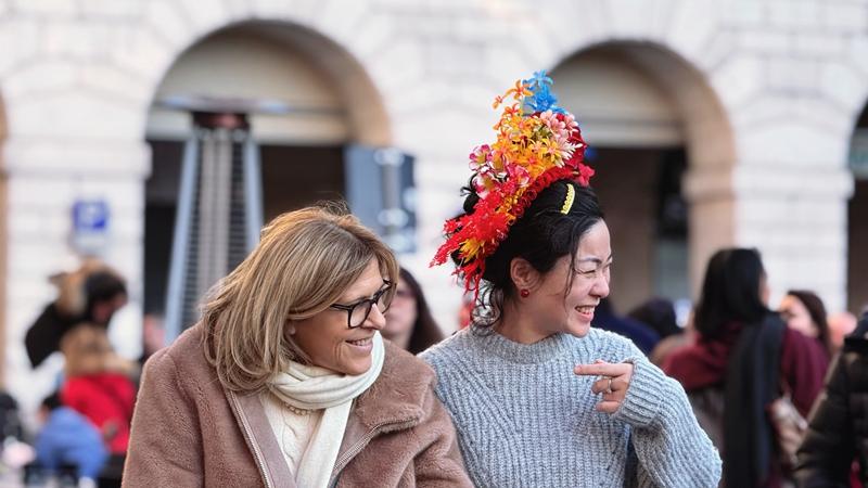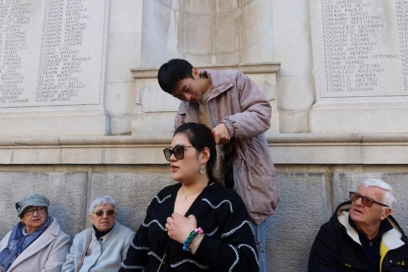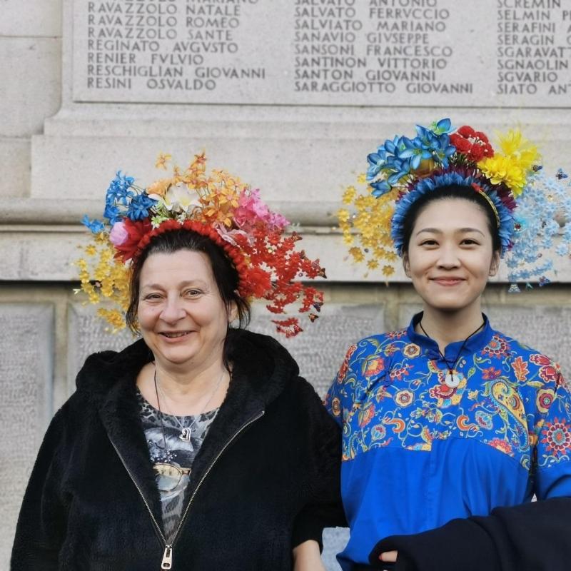 2月2日,农历大年初五,在中国新年互动开始前,陈铭权在帕多瓦市中心帮两位好朋友簪花。身边不断有意大利人围过来,了解这个头饰,原来他们都是要去参加中国新年庆祝活动的。后来陈铭权和朋友到了活动现场,除了中国人,站满了意大利人,看到朋友头顶的簪花,人们纷纷围过来请求合照,并陆续有更多中国人和意大利人希望陈铭权能够帮她们簪花。