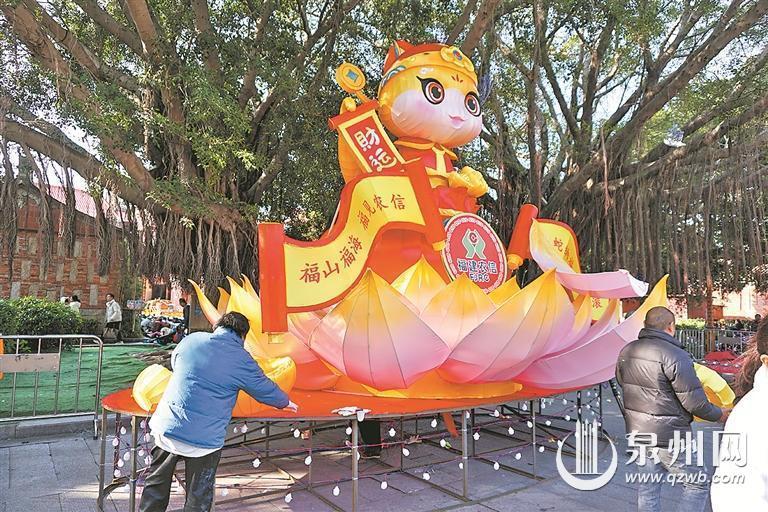 在府文庙前广场展区,工作人员正在加紧安装花灯。展区布置大型座灯4座、夜景氛围灯若干。该展区配套举办“新春元宵会、欢乐民俗年”活动,包括街头文化现场演出、灯谜竞猜、蛇年艺术装置等。