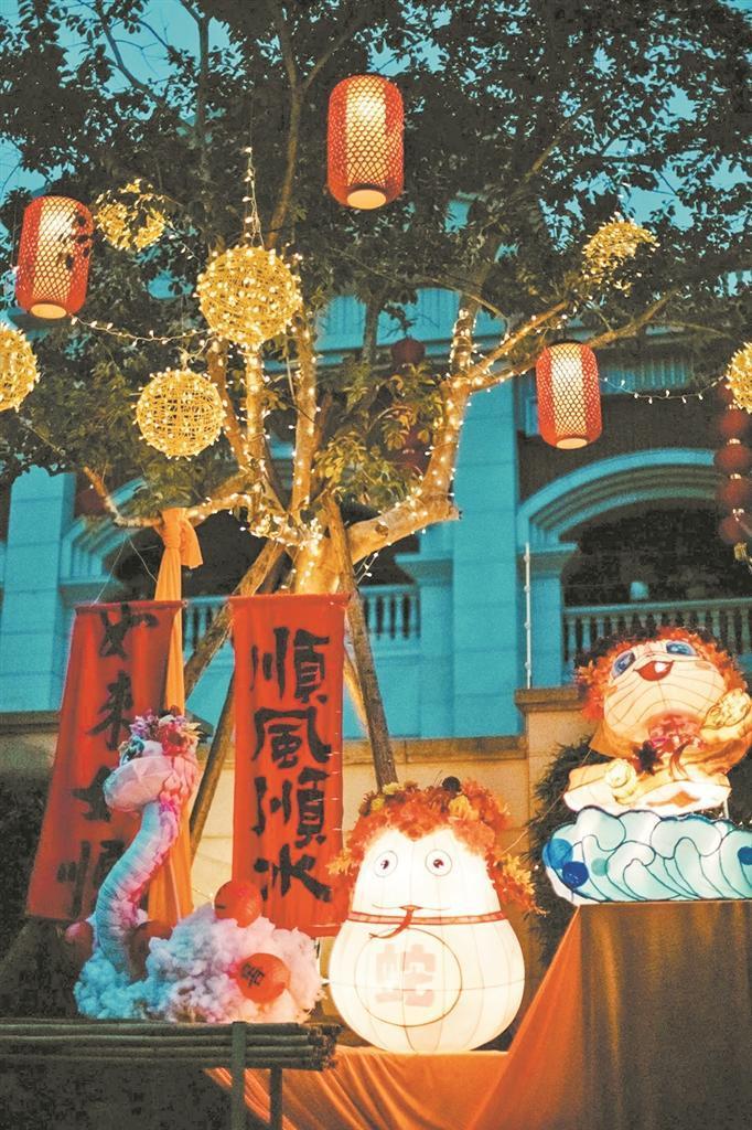 鲤城晋悦春江里展区,布置100盏传统灯笼、步步生花氛围灯、旋转楼梯以及1座特色大型钟楼座灯,配套非遗火龙打铁花等活动。