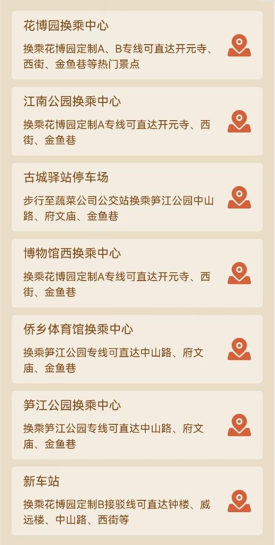 接驳公交运营时间为2025年2月10日至14日每日17时—23时30分,票价1元。其中,花博园定制A线直达开元寺、西街、金鱼巷;花博园定制B线直达钟楼、中山路、西街、文庙、威远楼、南俊巷;笋江公园接驳线直达关帝庙、府文庙、中山路。