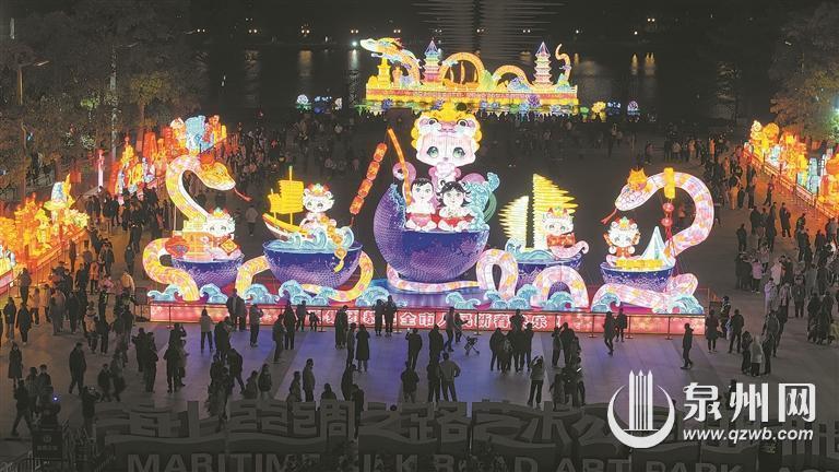 据了解,今年,海丝艺术公园以“梦幻滨海 活力绽放”为主题,结合蛇年生肖文化、海洋文化、海丝文化等元素精心设置特色花灯。“《蛇舞滨海》水上座灯是全市唯一大型水上座灯,其以洛阳桥为主要载体,还包含东西塔、漆线雕、月光宝塔等文化元素。另外,陆上主题座灯《蛇序呈祥》在设计上,以蛇蛋壳和地球相结合为载体,寓意新生与全球化,灯座中融入台商区的历史文化元素,让观众在欣赏美景的同时,感受到泉州深厚的文化底蕴。”福建泉州吴氏花灯工艺有限公司经理林军介绍。