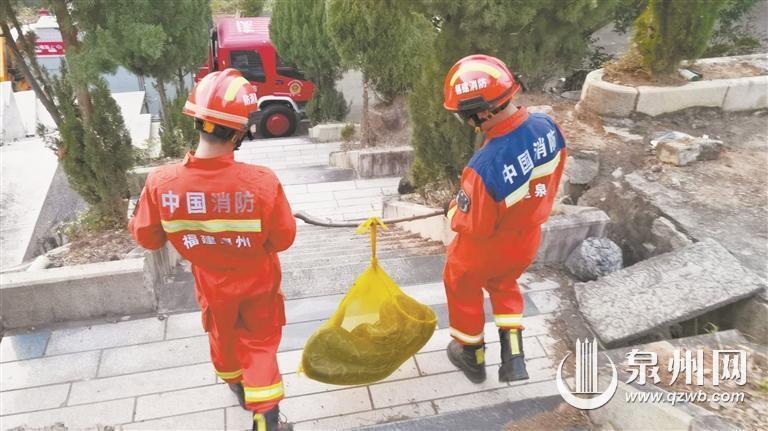 泉州网2月12日讯 (融媒体记者陈明华 通讯员陈龙山 郭云霞 吴文霞 文/图)2月10日16时15分许,泉港区涂岭镇松园村松园陵园出现一条大蛇,附近村民报警求助。接到指挥中心调度后,泉港区南埔消防救援站立即出动人员赶往现场处置。