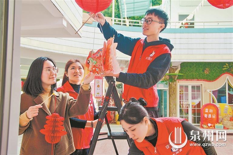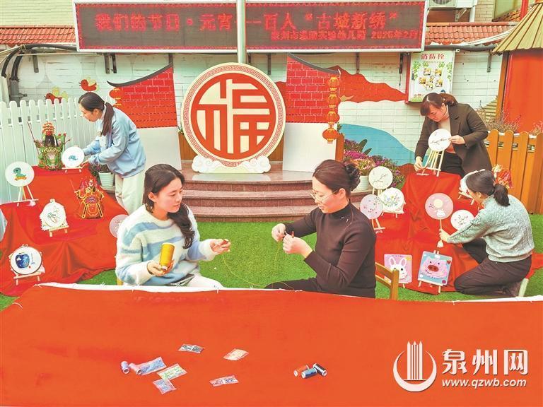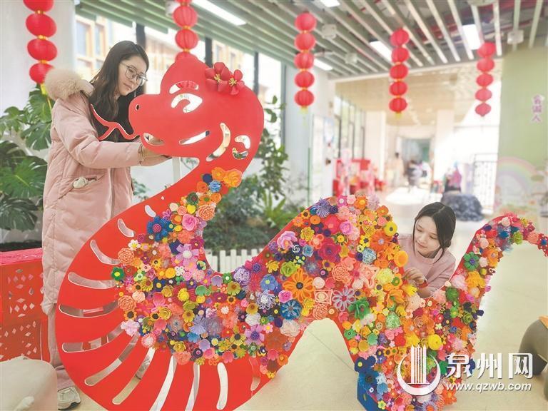 泉州市温陵实验幼儿园也张灯结彩,洋溢着喜庆氛围。为了让孩子们沉浸式体验中华传统佳节的文化魅力,学园精心创设环境,准备了丰富多彩的非遗活动。有的老师巧妙地利用灯笼创意制作飘逸灵动的飞蛇;有的老师用精美的装饰品,创设出“百人做元宵,甜蜜启新年”游戏区;有的老师精心布置“非遗彩灯点亮童心”活动场地。据悉,幼儿报到当天,学园还将举行“龙狮欢腾”“百人古城新绣”等活动,同时邀请剪纸、刻纸传承人、花灯工艺师等入园,让孩子们亲身参与非遗技艺的学习与实践。