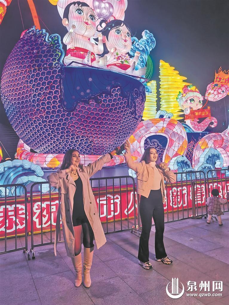 在海丝艺术公园,一座座绚丽多彩的花灯,造型美观、新颖别致,人们穿梭于璀璨灯火间,感受传统佳节的魅力。《蛇舞滨海》水上座灯如蛟龙出海,粼粼波光映照着非遗工匠打造的蛇形灯组;陆上主灯《蛇序呈祥》则通过光影雕塑重现“涨海声中万国商”盛况,让游客穿越宋元看海船扬帆。两座大型主灯交相辉映,吸引众多市民游客驻足打卡,记录下这流光溢彩的盛景。