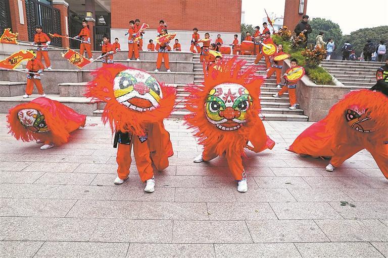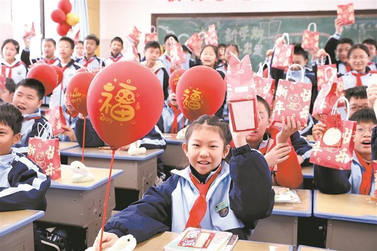 昨日一大早,泉州市通政中心小学热闹非凡。伴随着激昂的鼓点声,该校非遗青狮阵(刣狮)团队在校门口闪亮登场。6只青狮身姿矫健,翻滚跳跃,活力四射,表演还融入旗阵、盾牌刀、五祖拳等武术元素,刚劲有力,赢得现场阵阵掌声。“新年好!”……迎新志愿者们在一旁笑容满面,手持“敖读书”“野趣味”“好迫迌”等闽南语欢迎手卡,为每一位学生送上温馨问候。走进校园,砸金蛋、送果蔬、送糖果贺卡等丰富多样的迎新活动纷纷在各班级开展。“薯”你最棒、读书破万“卷”、“卜”学多才……在一年(10)班,萌娃们收到了满载祝福的“果蔬大礼包”,开心不已。