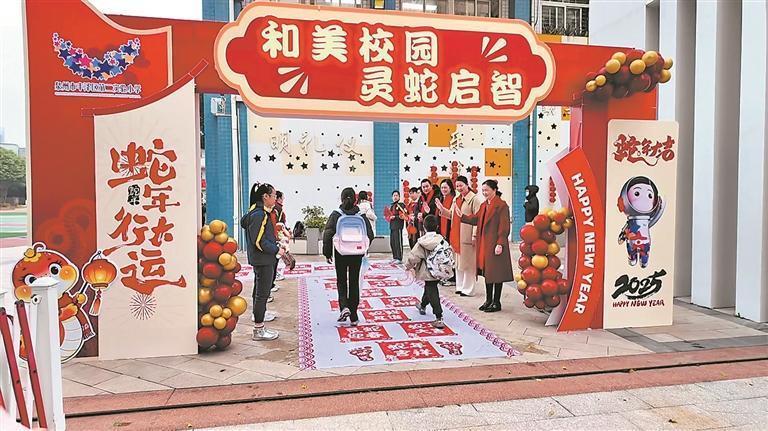 当天,丰泽区第二实验小学设置蛇年智慧门,师生进校后穿过蛇年智慧门,走上了铺满成长脚印地贴的“梦想通道”。蛇形图案,寓意灵蛇启程,踏“蛇”前行。星星图案象征逐梦星河,新学期每一步都扎实有力。随后,学校举行了“和美校园 灵蛇启智”2025年春季开学典礼。开学典礼上,精彩的舞蹈表演赢得现场阵阵掌声。