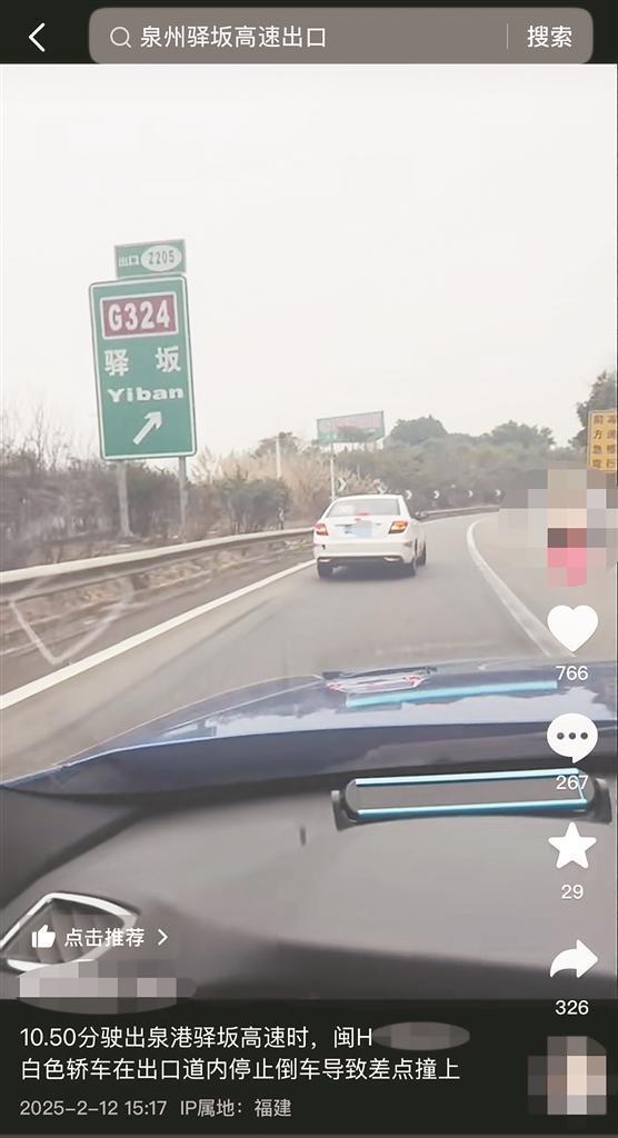 记者在抖音平台上浏览视频时发现了该曝光内容。“10点50分,要驶出泉港驿坂高速(出口)时,闽H×××××白色轿车在出口道内停止、倒车,导致差点撞上。”该视频发布于2月12日下午3时许,视频显示:在一块指示为“前往驿坂出口”的路牌下,一辆白色轿车停在车道上,亮起尾灯,正在倒车;见此情形,后车放缓车速,并长按喇叭,临近时停了下来。