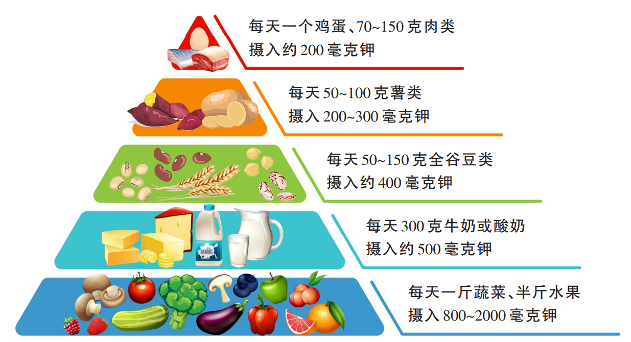 中国疾病预防控制中心营养与健康所研究员张倩表示,可以根据下面这座膳食补钾“金字塔”来补充。
